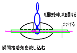 (発光玉の穴から爪楊枝を入れハリス止めの環の向きを調整しておく)