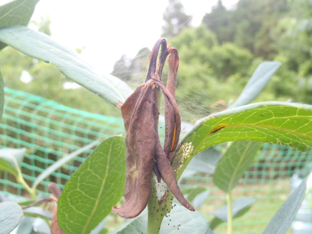 この時期になると、いつも新芽の先端が枯れて黒焦げになった様な状態になり、その場所にクモの巣が張ります。
