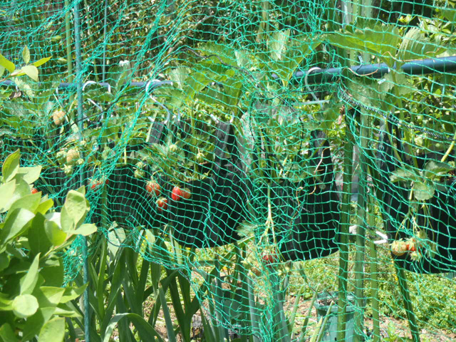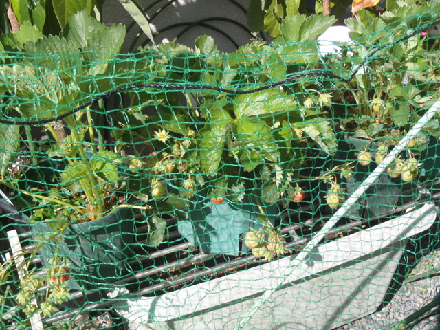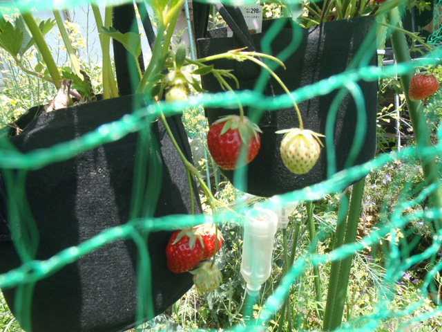 熟して真っ赤っ赤になったイチゴを2日連続で鳥に横取りされて、カミサンにえらく怒られました。