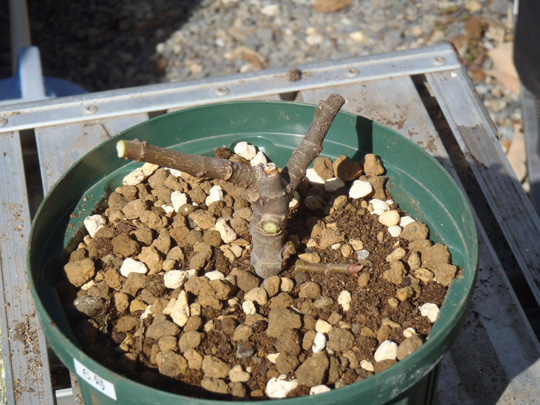 D抜いたイチジクを鉢に戻し、土を入れる。(上面がウオータースペースのギリになるようにする)