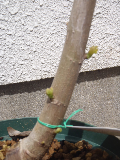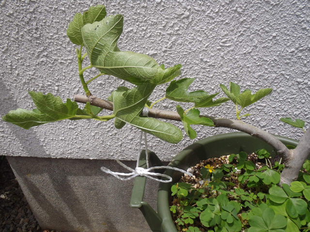 たまたま左右に枝がのびていたので、ひもで枝が地面と平行になるように誘因してみました。