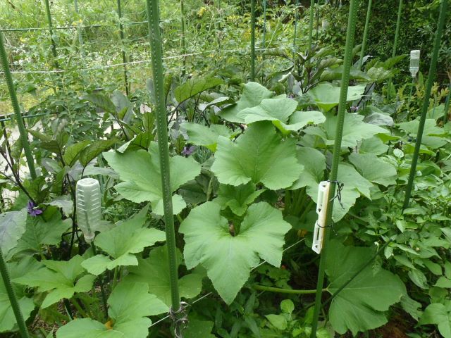 ナスとピーマンの間の隙間に植えてあるから密林状態。
