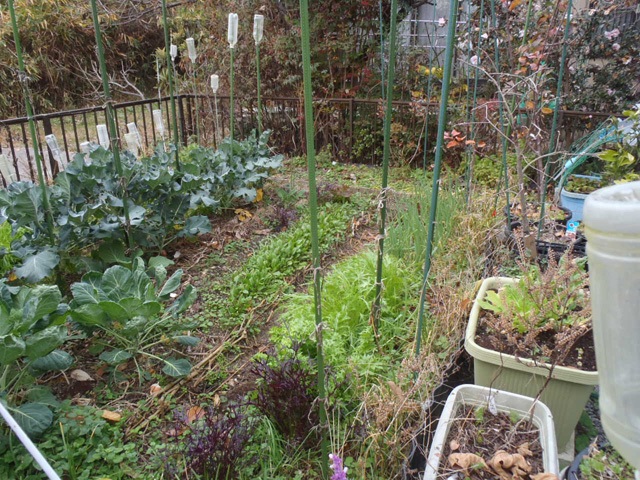 背が高くなり、野菜への日当たりが悪い時は邪魔な部分だけハサミで切り、切った部分は畑に放置。