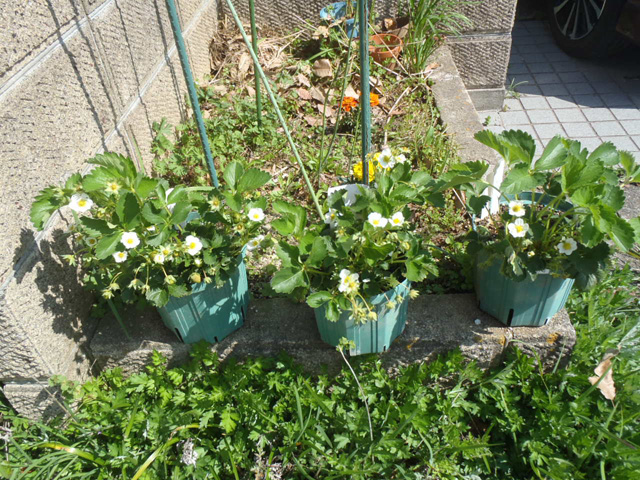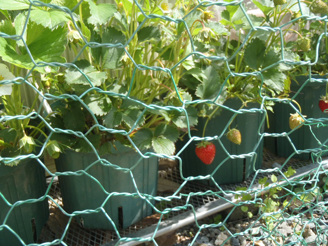 熟して真っ赤っ赤になったイチゴを2日連続で鳥に横取りされて、カミサンにえらく怒られました。