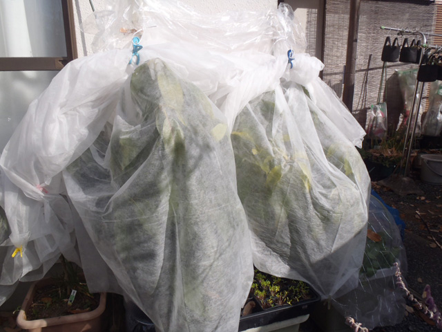 | 寒風除けにビニールを下した状態。天気の良い昼間はこの状態で多少なりとも光合成ができればと。 |