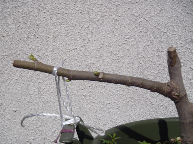 たまたま左右に枝がのびていたので、ひもで枝が地面と平行になるように誘因してみました。